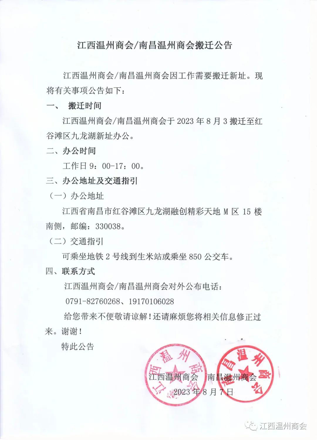【重要公告】 /南昌温州商会办公地点的迁址公告