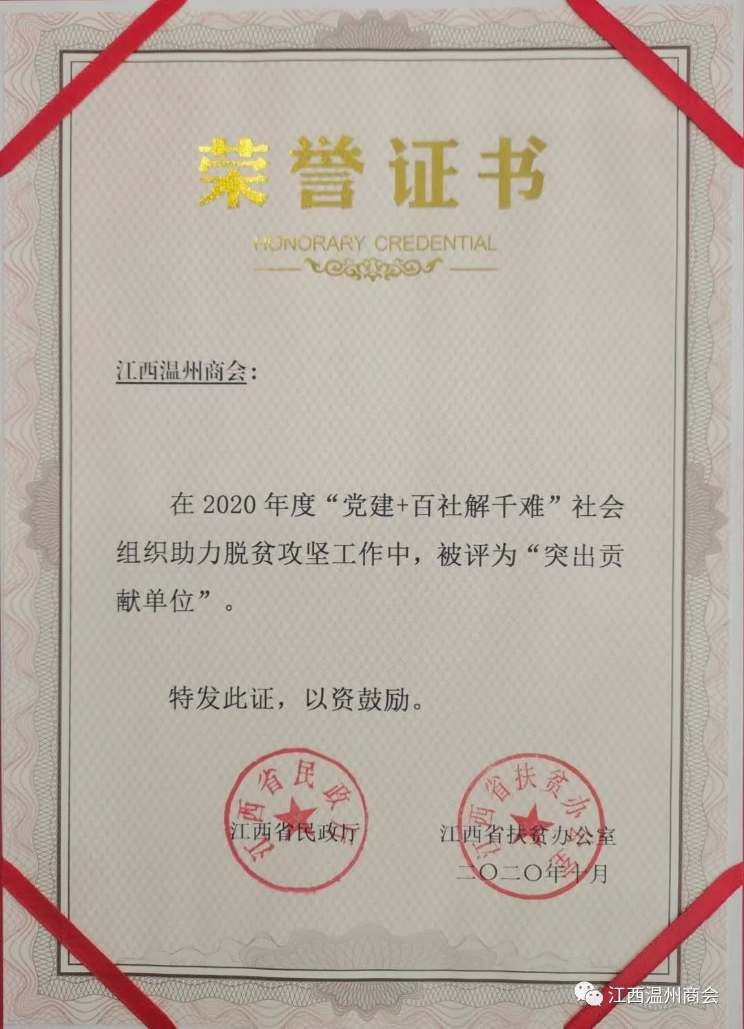 会议通报了2019年“党建+百社解千难”江西社会组织参与支援新疆阿克陶、助力黎川县脱贫攻坚工作总体情况。对“党建+百社解千难”助力脱贫攻坚做出积极贡献的社会组织给予通报表扬。省慈善总会、省灯饰照明行业协会、省残疾人事业发展促进会、赣州市赣商联合会、黎川县民政局代表纷纷发言。会上, 被江西省民政厅、江西省扶贫办评为“2020年度“党建+百社解千难”社会组织助力脱贫攻坚“突出贡献单位”。