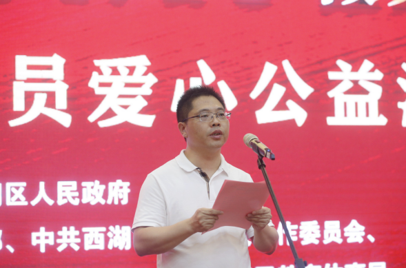 6月2日下午,西湖区“学党史 润童心 做先锋--送‘名著小书包’”党员爱心公益活动发放仪式在区行政中心8号楼会议室举行。区政府区长陶亿国出席并致辞,区委常委、组织部部长王新主持发放仪式,区政府副区长王光、区政协副主席吴新生出席仪式。