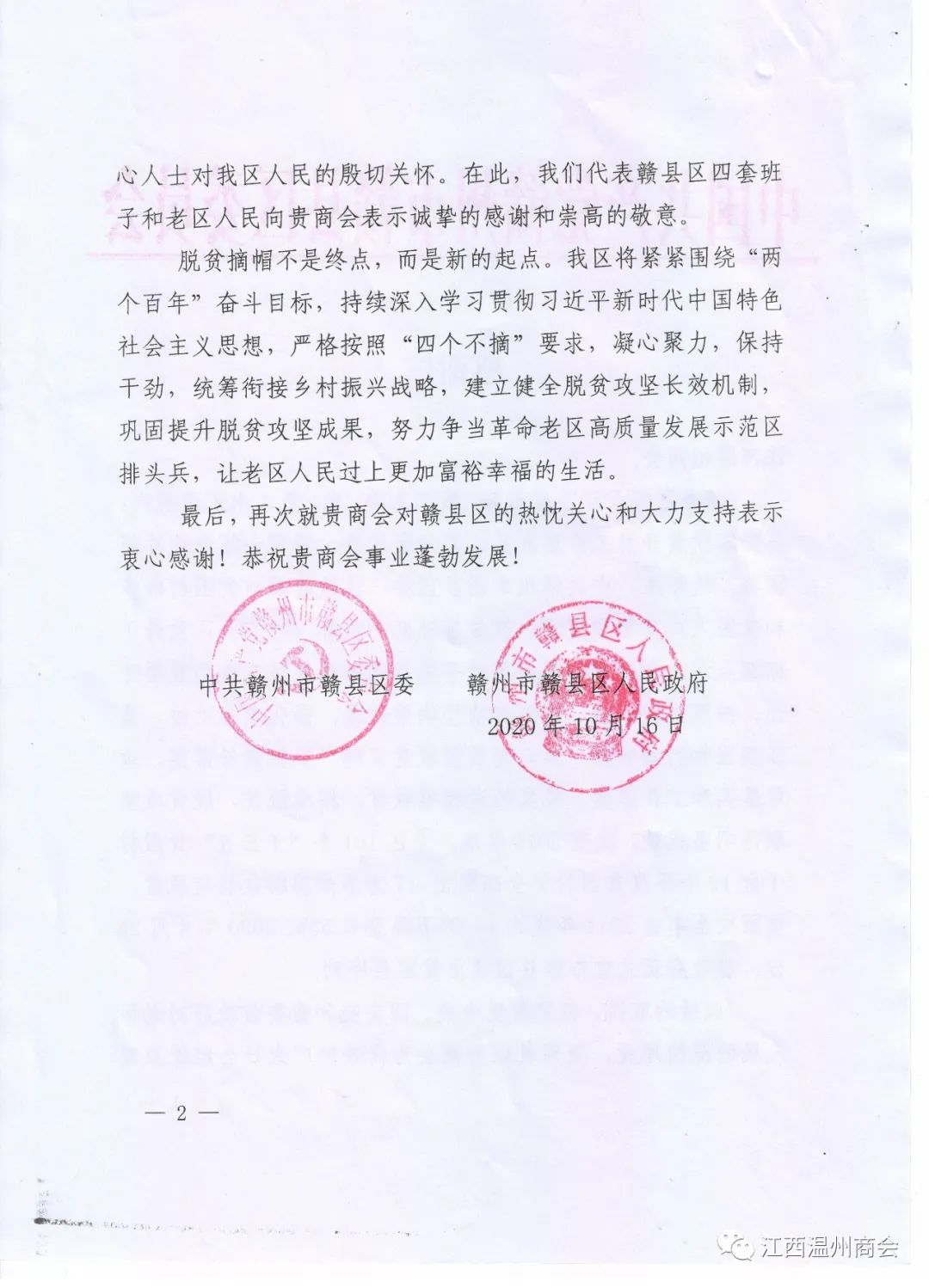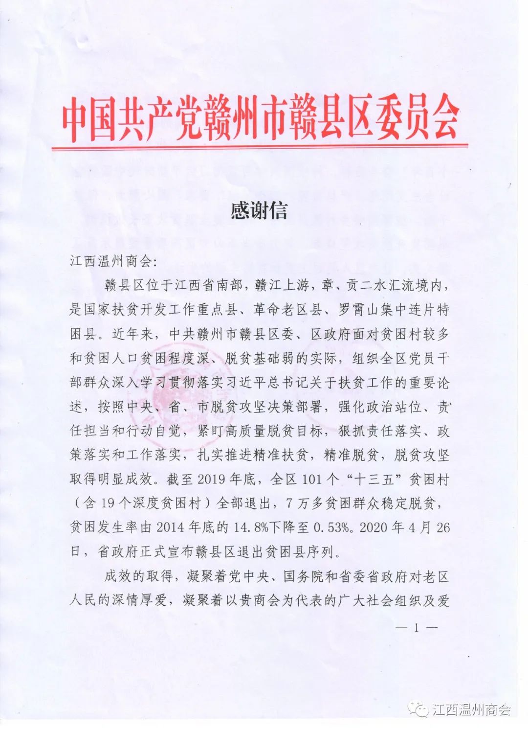 发来感谢信,感谢商会对赣县区的关心和支持。