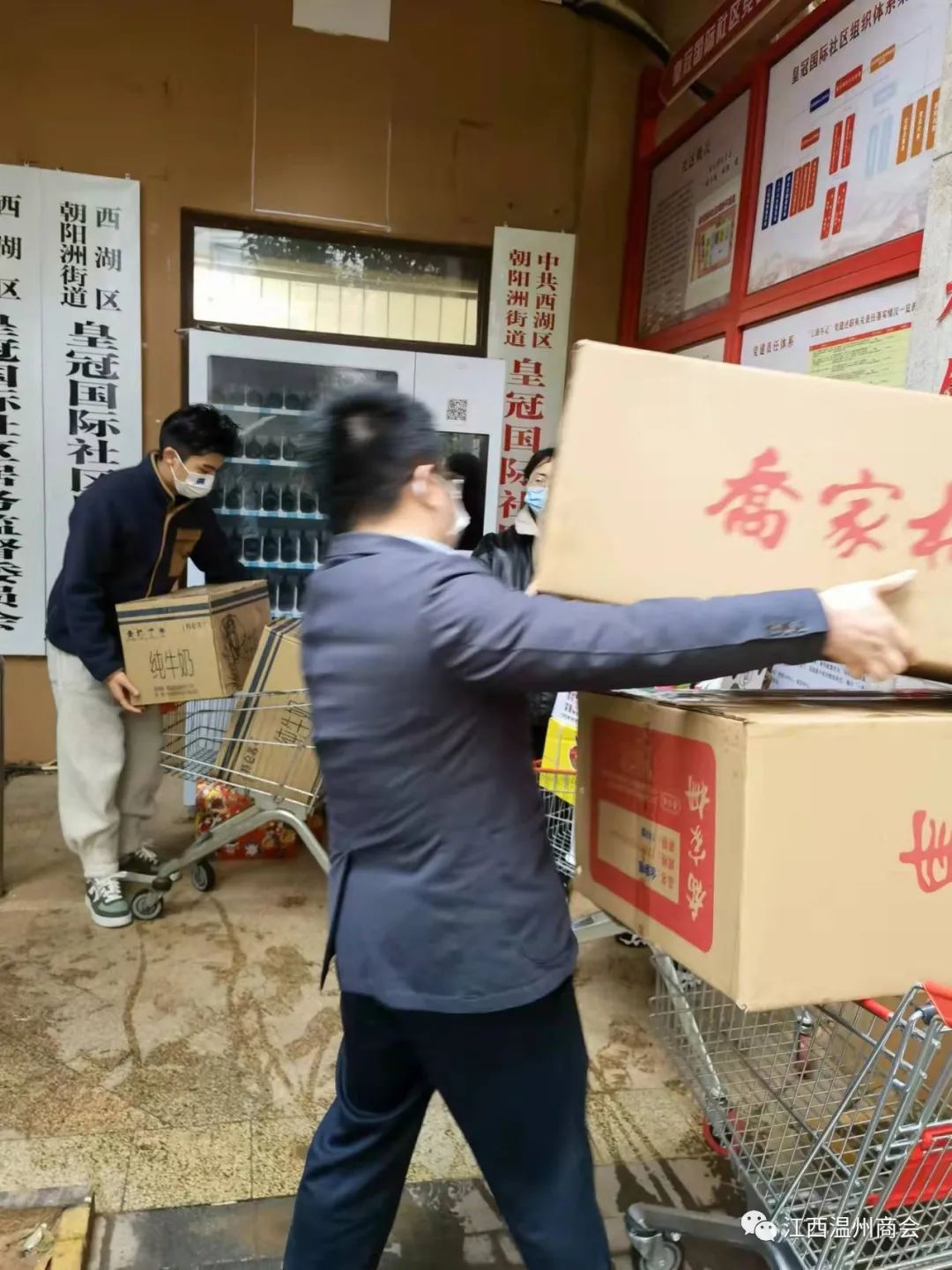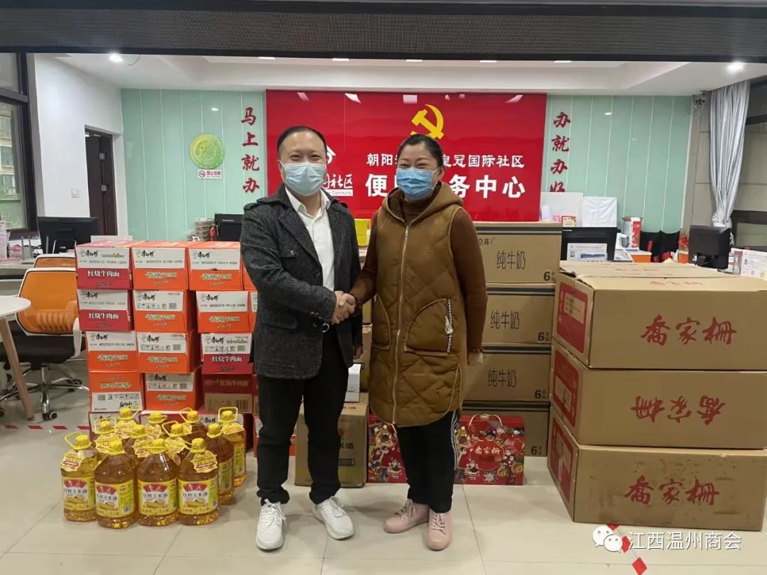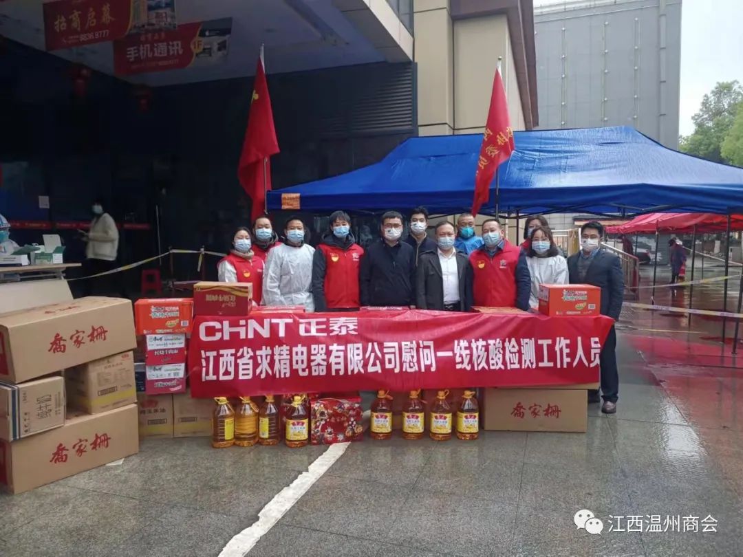 此次突发的疫情反弹并正在肆虐着南昌英雄城,人民群众的生命及健康正在受到极大的侵害,陈雄看在眼里,急在心里,疫不容辞、同心战疫!为那些保障人民群众生命安全奋战在一线的核酸检测工作人员送上慰问品,送上关怀!送上一片爱心!江西省求精电器有限公司在陈雄的带领下分别看望了在一线工作的西湖街办、朝阳街办工作人员,并向奋战在一线的最美逆行者送去了鲁花油、方便面、乔家珊桃酥、特仑苏牛奶,口罩消毒水等慰问品。陈雄本人还在第一时间报名参加南昌温州商会党支部组织的疫情防控志愿者活动,用自已的行动,为战胜疫情奉献自已的一份力量。